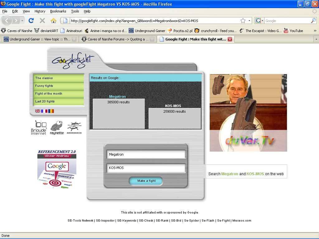 Then again, Googlefight isn't always accurate; it gives "KOS-MOS" (with the quotes) less than 100,000 results.
